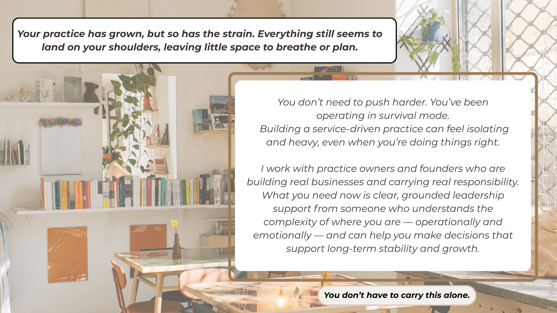 We focus on clarity, leadership development, sustainable growth, and navigating the real challenges of running and expanding a practice.